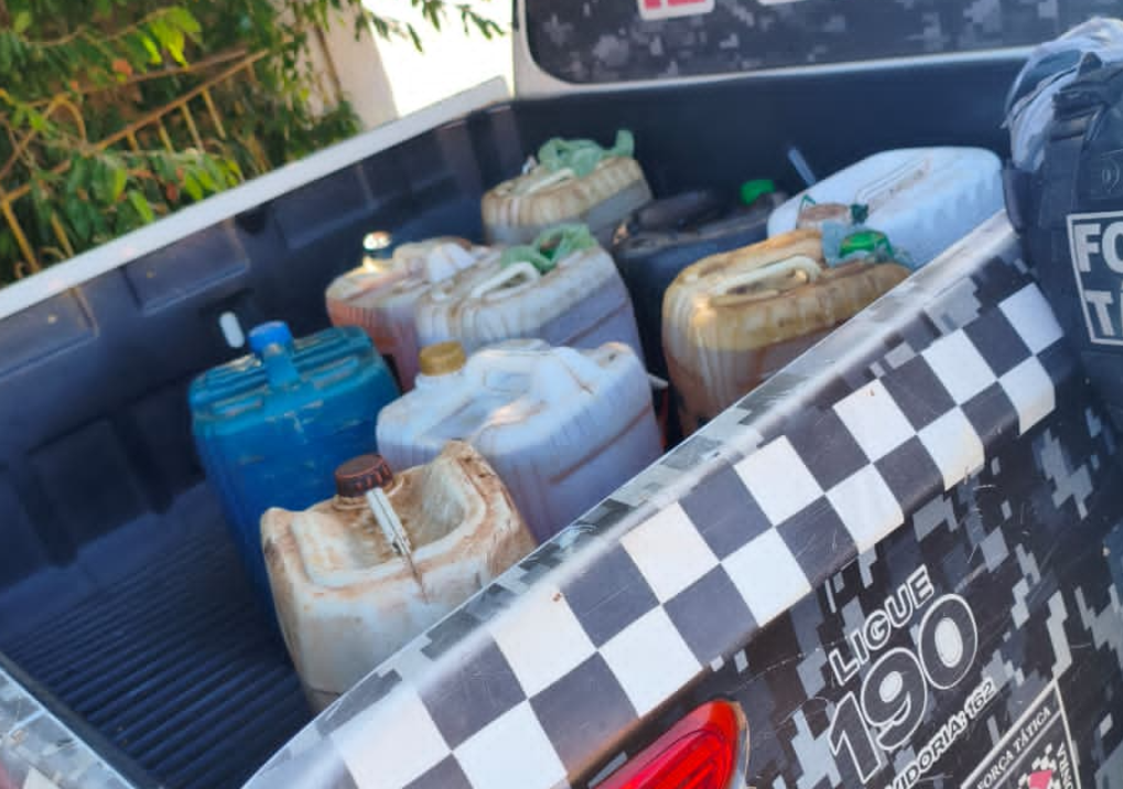 Durante a abordagem, os policiais localizaram o suspeito e apreenderam o material furtado. Ao todo, foram encontrados 10 galões de diesel.